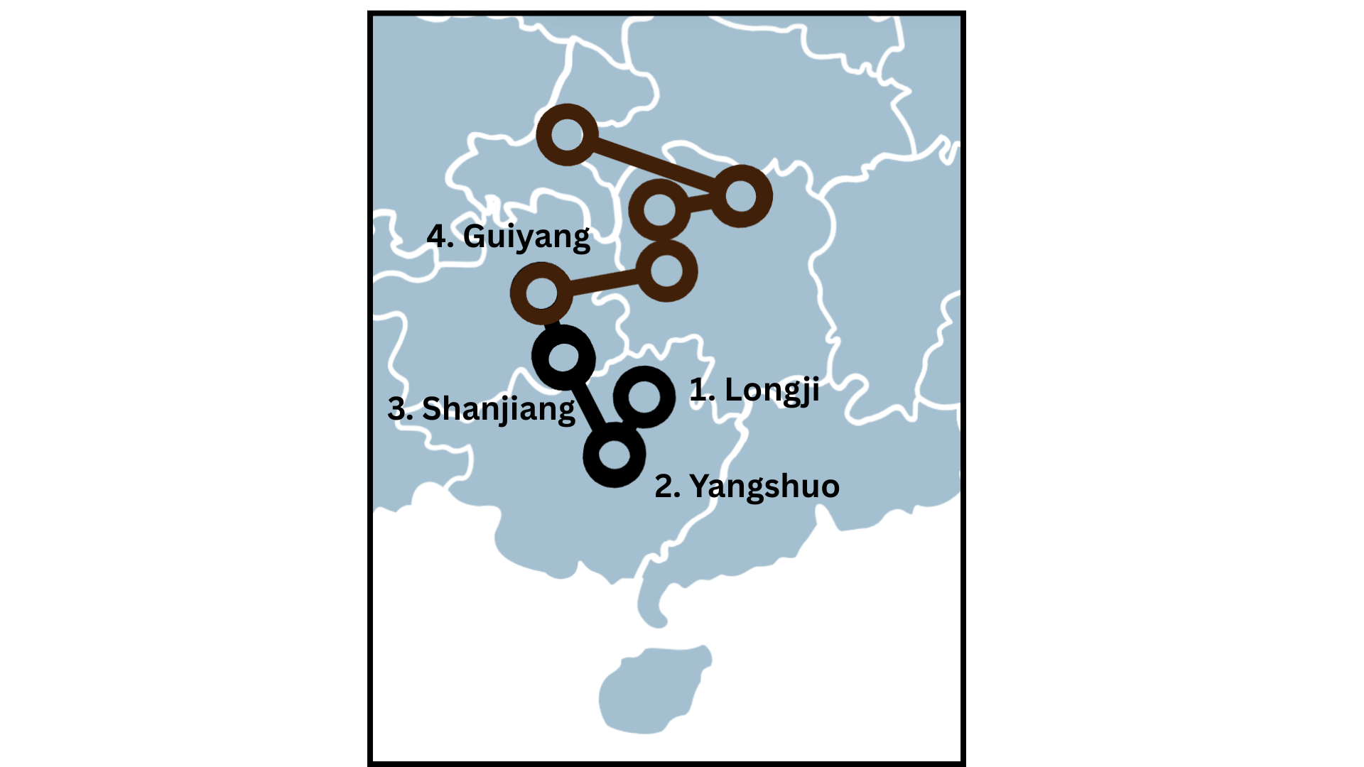 Route 1: Guilin – Yangshuo – Longji – Sanjiang – Kaili - Guiyang (Zhuang & Dong cultures)